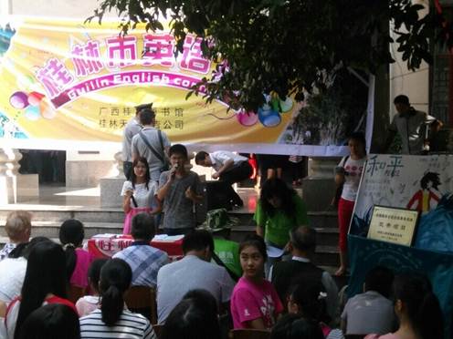 2014年9月21日,桂林航天工业学院英语协会在桂林市榕湖图书馆举办了以“PEACE”为主题的英语角主题活动。桂林市英语角主要负责人、桂林市十大高校英语协会成员、英语角外国友人、我校泰国留学生以及社会各界广大的英语爱好者出席和参加了本次活动。
